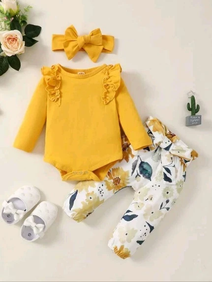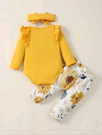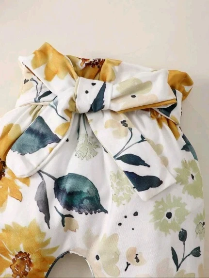 بدلة طفلة رضيعة بحواف التكسير وبنطلون واسع مطبوع بالأزهار مع حزام مرن على الخصر وشريط رأس