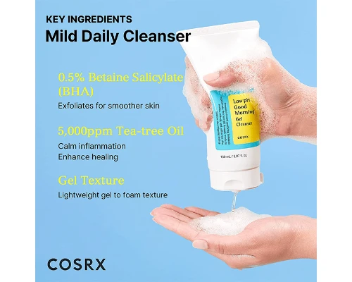 غسول جل قود مورنينق منخفض الحموضة من كوسركس لبشرة ناعمة ومنتعشة غسول لطيف على الوجه ومثالي للصباح. ينظف البشرة بسلاسة مع الحفاظ على مستوى درجة الحموضة الأمثل لتوهج صحي لبشرتك. يحتوي على زيت شجرة الشاي وبيتين ساليسيلات ليلطف البشرة ويقويها للحصول على بشرة نقية ومشرقة. يزيل الدهون الزائدة والجلد الميت والمكياج والمستحضرات الأخرى التي تستخدمينها ويعيد التوازن لحموضة البشرة. مناسب للبشرة الحساسة. يزيل الشوائب وينقي البشرة. ينظف البشرة بعمق. يترك البشرة رطبة طوال اليوم. المعلومات: