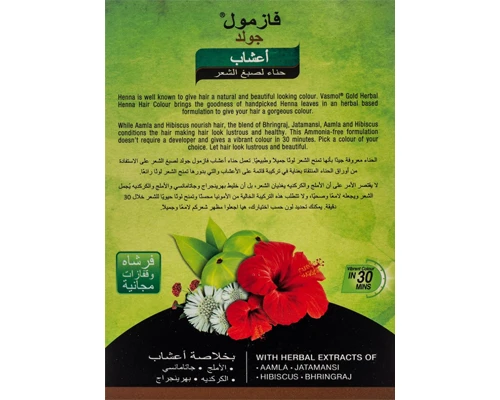 الحناء معروفة بمنح الشعر لونًا طبيعيًا وجميلًا. صبغة شعر الحناء الذهبية العشبية من فازمول. تجمع هذه الصبغة بين فوائد أوراق الحناء المختارة يدويًا، بتركيبة عشبية، لتمنح شعرك لونًا رائعًا. بينما يُرطب الأملا والكركديه الشعر، مما يجعله يبدو لامعًا وصحيًا. هذه التركيبة الخالية من الأمونيا لا تتطلب مُظهِرًا، وتمنحك لونًا نابضًا بالحياة في 30 دقيقة. اختاري اللون الذي يناسبك. دعي شعرك يبدو لامعًا وجميلًا. |