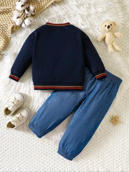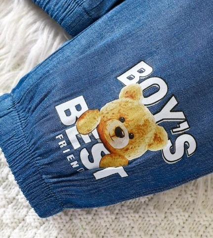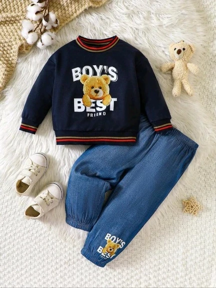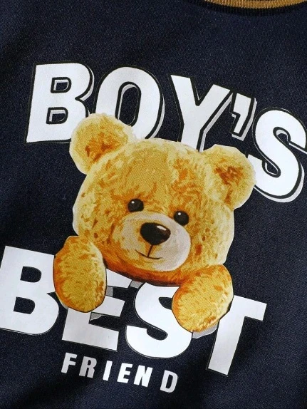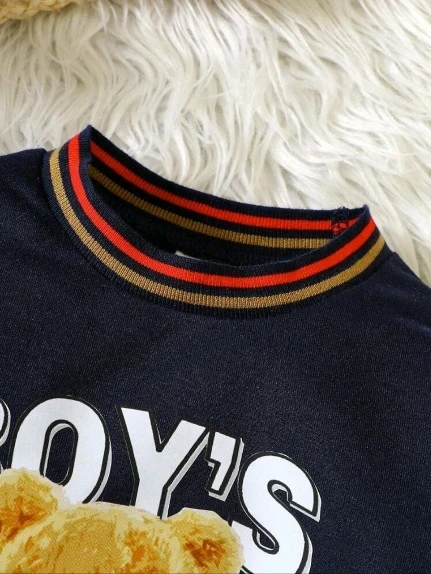 قميص ثقيل مع بنطلون بجرافيك عبارة ودب مقلم مخطط للاولاد الاطفال